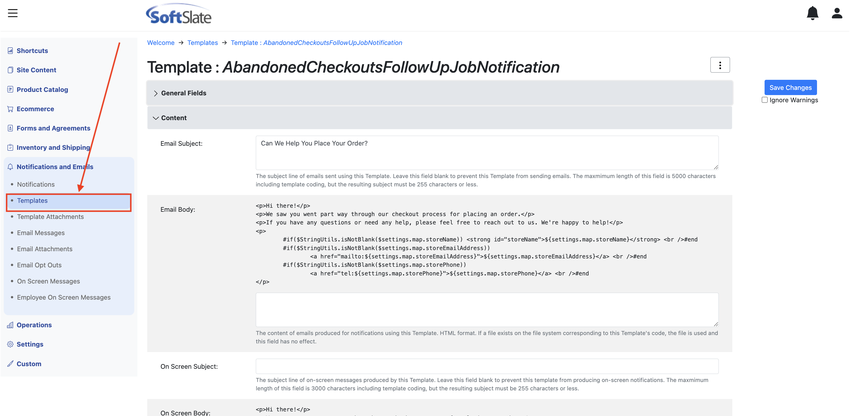 By default the template used for the abandoned checkout emails is pretty basic - it simply asks if the customer ran into any issues and invites them to contact you. You can modify the email subject and body text by editing the AbandonedCheckoutsFollowUpJobNotification template, which can be found under Notifications and Emails -> Templates: